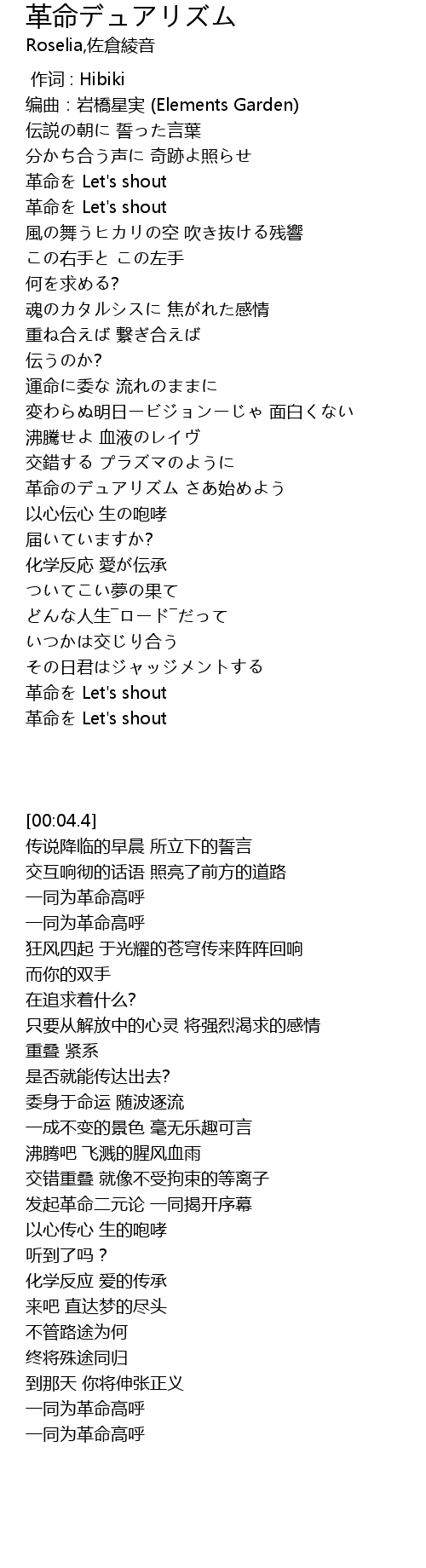 | [00:15.51] | 革命を Let's shout |