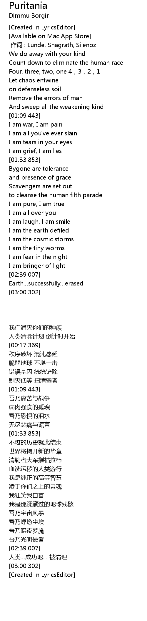 | [00:00.00] | zuò cí : Lunde, Shagrath, Silenoz |