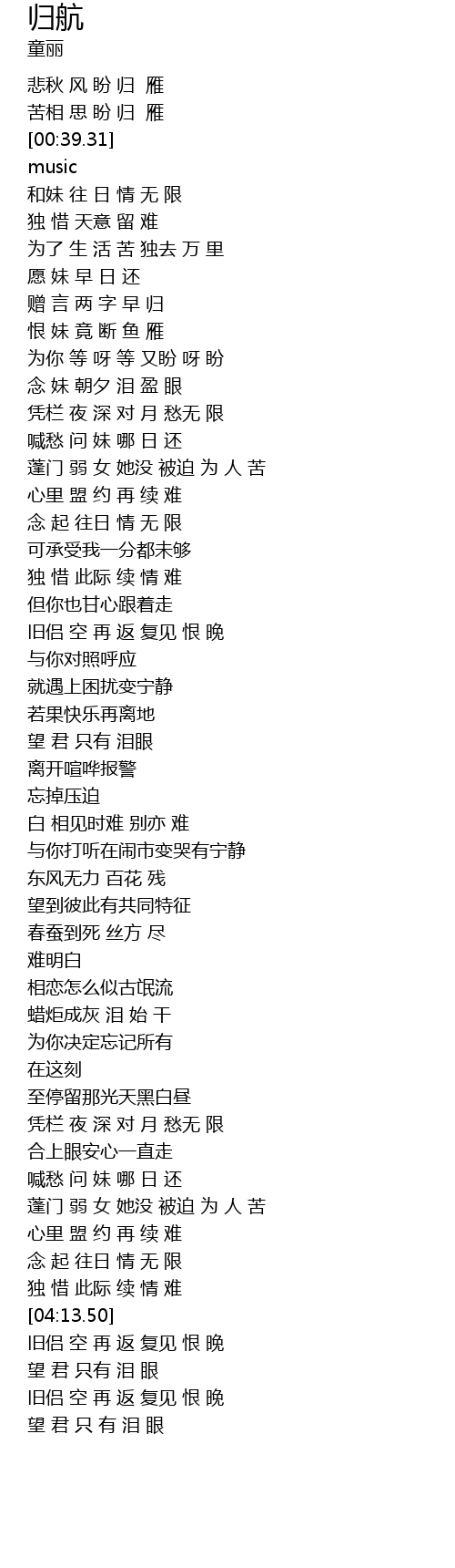 | [03:41.13] | 喊愁 问 妹 哪 日 还 |