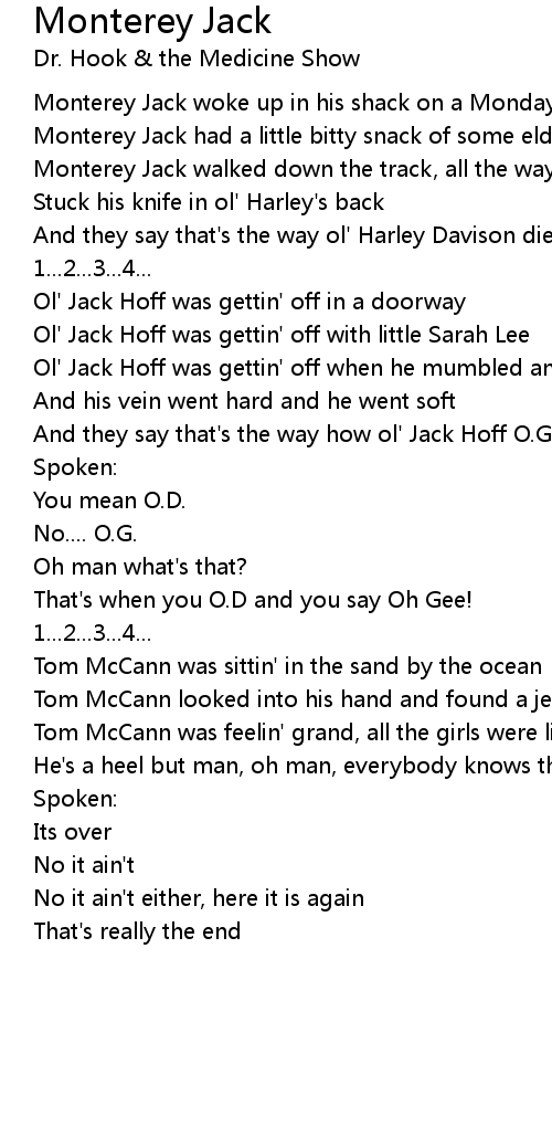Monterey Jack walked down the track, all the way to ol' Harley's shack |