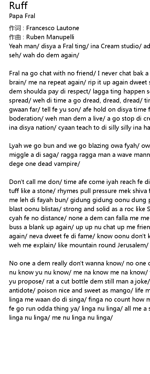 | No one a dem really don' t wanna know no one of oonu really know weh me know yu nu know yu nu know me na know me na know weh yu think bout di choble dem what yu propose rat a cut bottle dem still man a joke man prefa poison to di antidote poison nice and sweet as mango life mo bitta dan ginger linga nu linga me waan do di singa finga no count how many time dem iyah figet me dream fe go run odda thing ya linga nu linga all me a seh linga nu linga linga nu linga nu linga me nu linga nu linga |