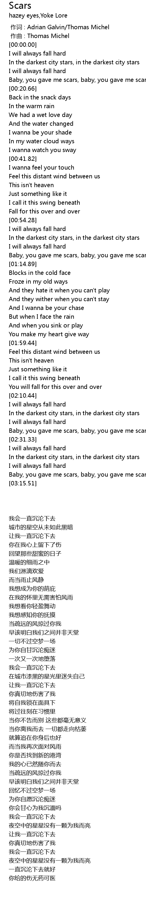 | [03:08.28] | Baby, you gave me scars, baby, you gave me scars |