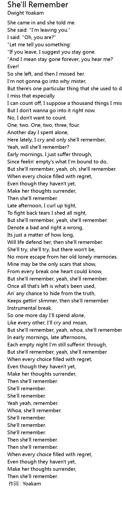 | But she' ll remember, yeah, whoa, she' ll remember. | |