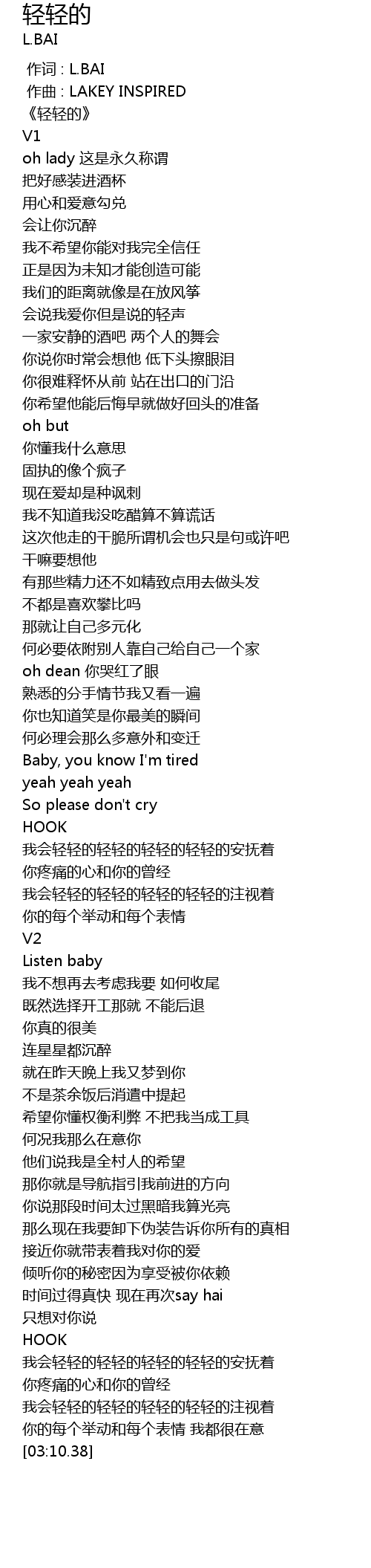 | [02:46.56] | 我会轻轻的轻轻的轻轻的轻轻的安抚着 |