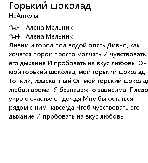 | Ливни и город под водой опять Дивно, как хочется порой просто молчать И чувствовать его дыхание И пробовать на вкус любовь Он мой горький шоколад, мой горький шоколад Тонкий, изысканный Он мой горький шоколад, любви аромат Я безнадежно зависима Пледом укрою счастье от дождя Мне бы остаться рядом с ним навсегда Чтоб чувствовать его дыхание И пробовать на вкус любовь |