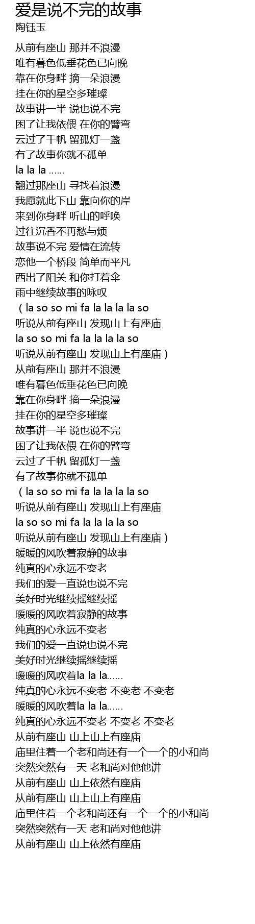 | [03:32.54] | cóng qián yǒu zuò shān shān shàng shān shàng yǒu zuò miào |
