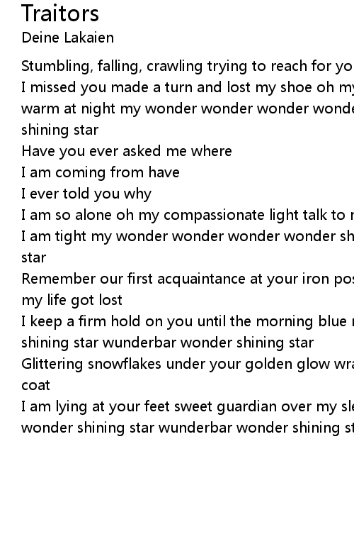 I missed you made a turn and lost my shoe oh my dear street light you keep me warm at night my wonder wonder wonder wonder shining star wunderbar wonder shining star |