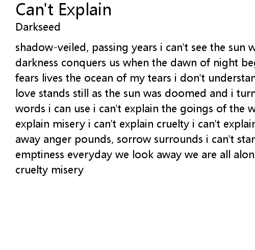 shadow-veiled, passing years i can't see the sun where's the land of friends? darkness conquers us when the dawn of night begins deep beneath my chilling fears lives the ocean of my tears i don't understand the world bodies frozen, love stands still as the sun was doomed and i turn to look to you there are no words i can use i can't explain the goings of the world dark and cold i can't explain misery i can't explain cruelty i can't explain success of lying i turn away anger pounds, sorrow surrounds i can't stand this pain neverending emptiness everyday we look away we are all alone i am sorry i can't explain cruelty misery |