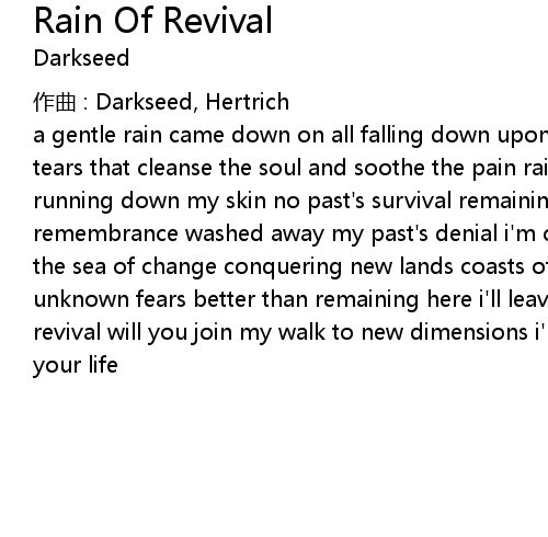 | a gentle rain came down on all falling down upon the world washing away our sins tears that cleanse the soul and soothe the pain rain of revival rain of revival running down my skin no past's survival remaining in my heart rain of revival remembrance washed away my past's denial i'm challenging the day i'm sailing on the sea of change conquering new lands coasts of new adventures unknown tasks, unknown fears better than remaining here i'll leave the world behind rain of revival will you join my walk to new dimensions i'll take your hand to change your life |