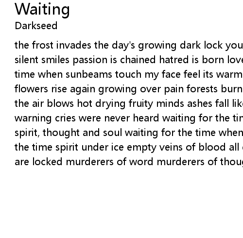the frost invades the day's growing dark lock your doors misery arrives black, silent smiles passion is chained hatred is born love forlorn waiting for the time when sunbeams touch my face feel its warm embrace waiting for the time when flowers rise again growing over pain forests burning bright fire finds new home the air blows hot drying fruity minds ashes fall like snow burying our souls my warning cries were never heard waiting for the time when words will win again spirit, thought and soul waiting for the time when jealousy will die waiting for the time spirit under ice empty veins of blood all ears are closed all mouths are locked murderers of word murderers of thought rivers flood down my cheeks