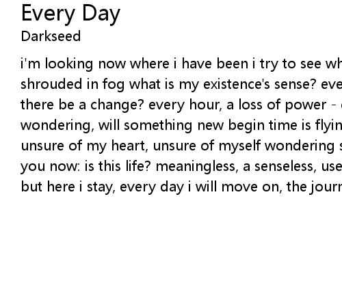 i'm looking now where i have been i try to see where i will go this are two ways shrouded in fog what is my existence's sense? every day i'm wondering, will there be a change? every hour, a loss of power - every day every day i'm wondering, will something new begin time is flying, minutes dying - every day unsure of my heart, unsure of myself wondering silently of what could be i ask you now: is this life? meaningless, a senseless, useless way shattered nerves, but here i stay, every day i will move on, the journey never ends |