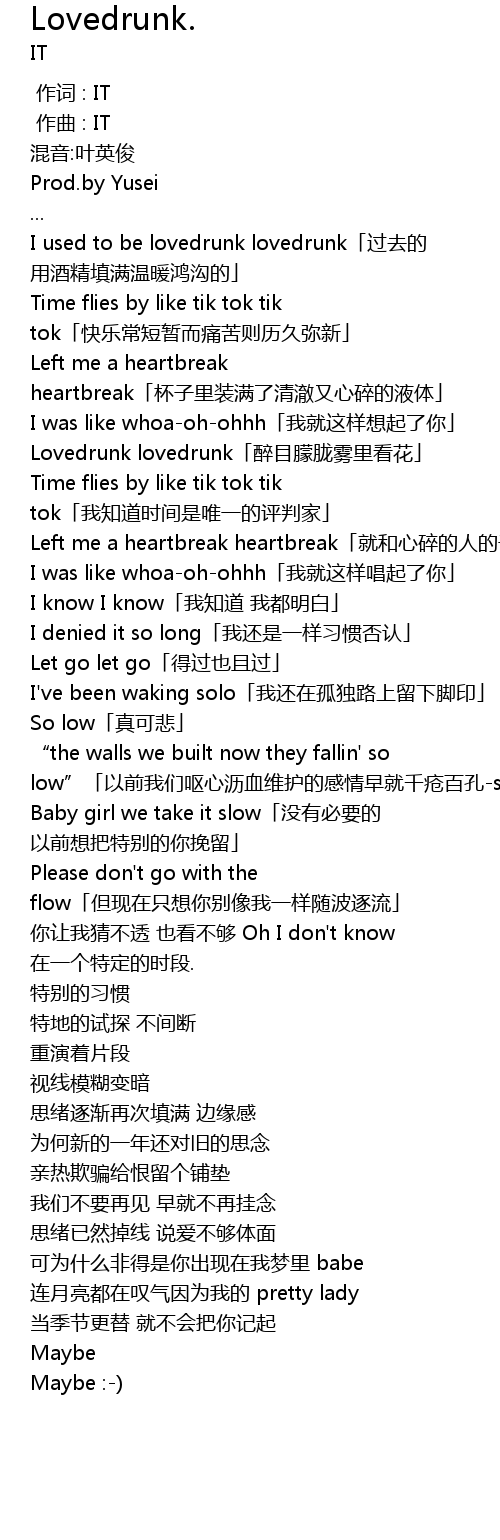 | [00:33.458] | I used to be lovedrunk lovedrunk「过去的 用酒精填满温暖鸿沟的」 |