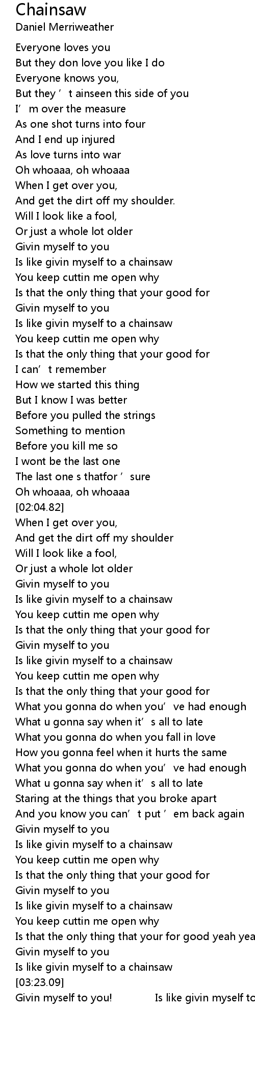 | [03:00.41] | Is like givin myself to a chainsaw |