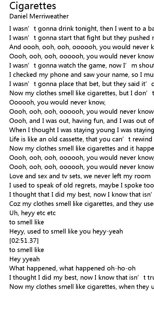 | [00:55.18] | Now my clothes smell like cigarettes, but I don' t smoke at all, |