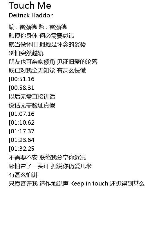 | [03:09.47] | 只愿容许我 造作地说声 Keep in touch 还想得到甚么 |