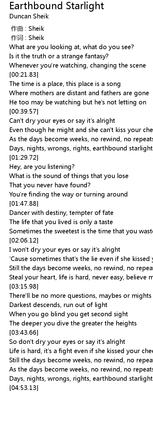 | [04:41.97] | Days, nights, wrongs, rights, earthbound starlight |