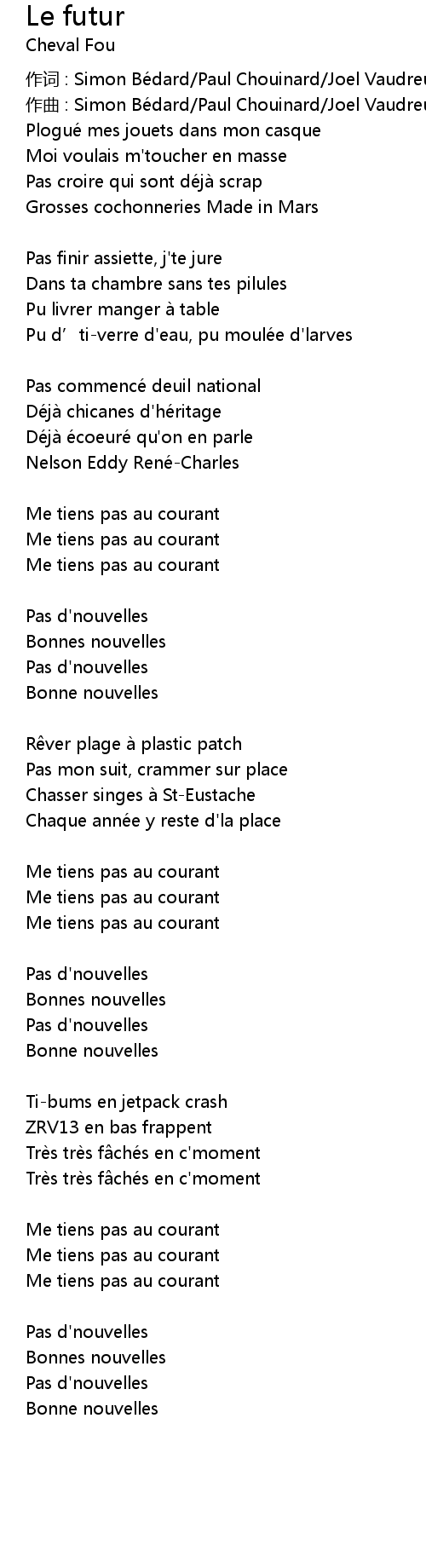 | 作词 : Simon Bédard/Paul Chouinard/Joel Vaudreuil/Maxime Veilleux | |