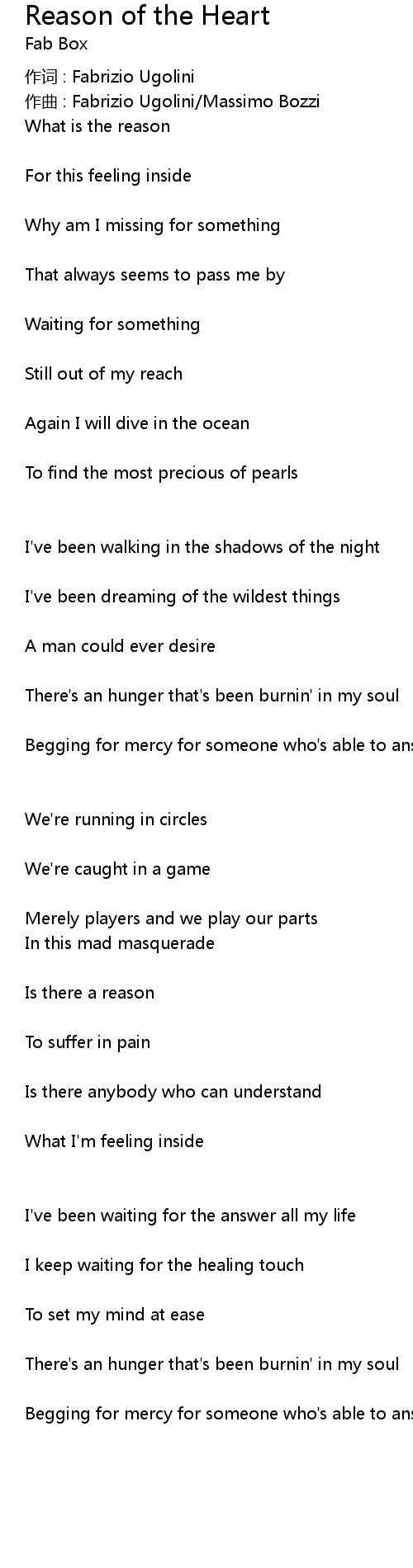 | Song | Reason of the Heart |
