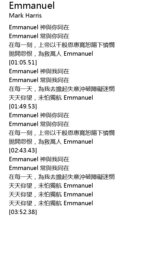 | [00:22.35] | Emmanuel 神與你同在 |