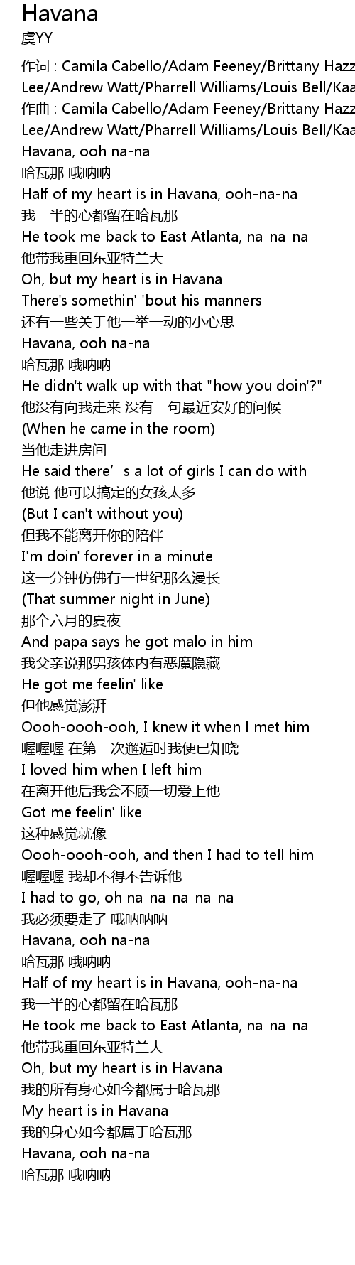 | 作词 : Camila Cabello/Adam Feeney/Brittany Hazzard/Ali Tamposi/Brian Lee/Andrew Watt/Pharrell Williams/Louis Bell/Kaan Gunesberk | |