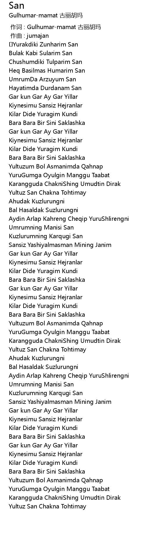 | [00:00.000] | 作词 : Gulhumar-mamat 古丽胡玛 |