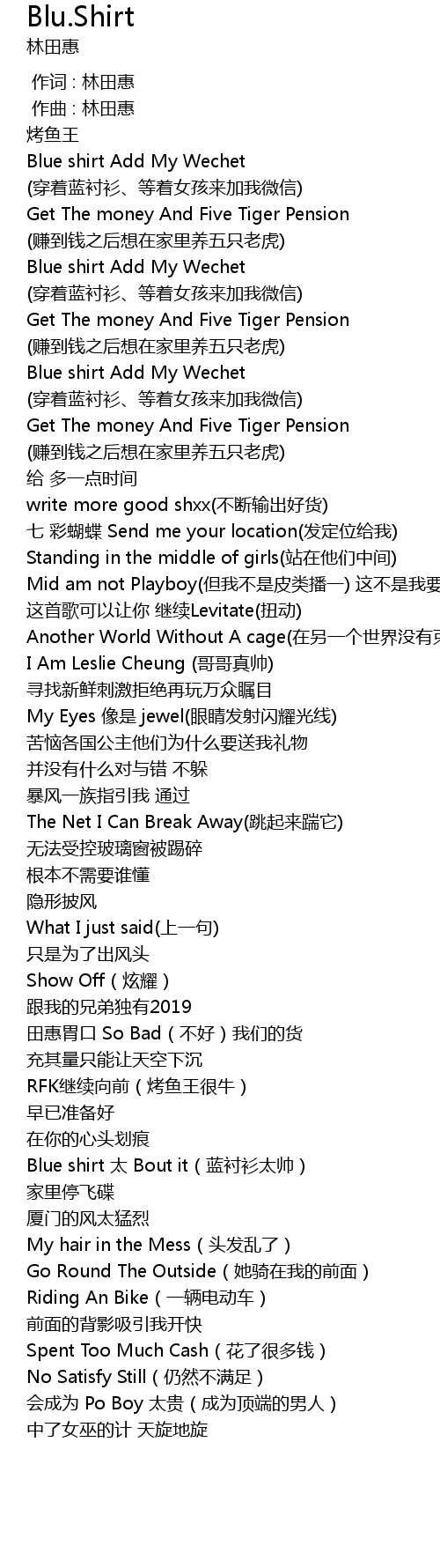 | [01:13.213] | Blue shirt 太 Bout it(蓝衬衫太帅) |