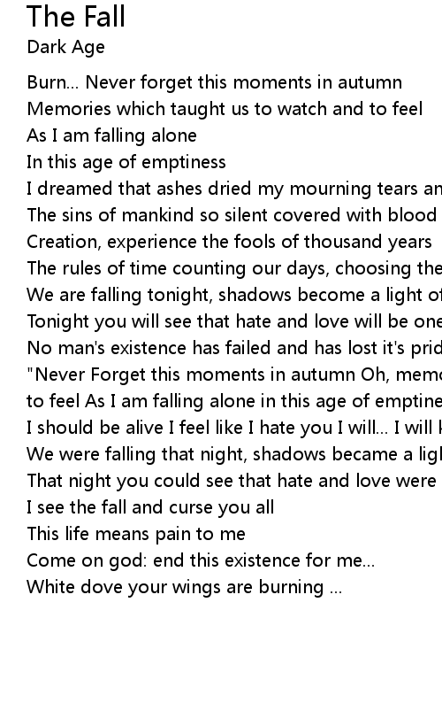 | No man's existence has failed and has lost it's pride, it's smile, it's cries... "Never Forget this moments in autumn Oh, memories which taught us to watch and to feel As I am falling alone in this age of emptiness Again I am falling alone I should be alive I feel like I hate you I will... I will kill you..." | |