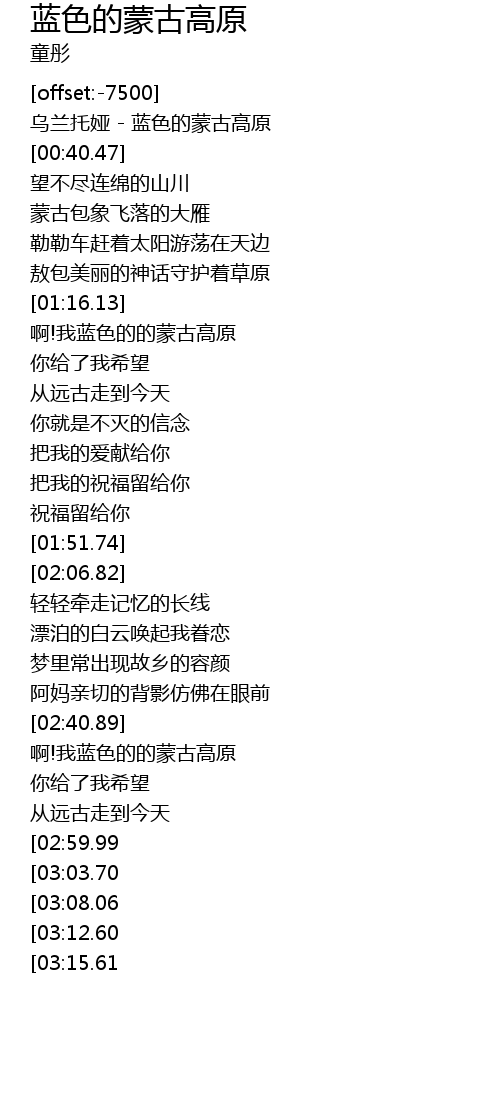 | [00:00.00] | wū lán tuō yà lán sè de méng gǔ gāo yuán |