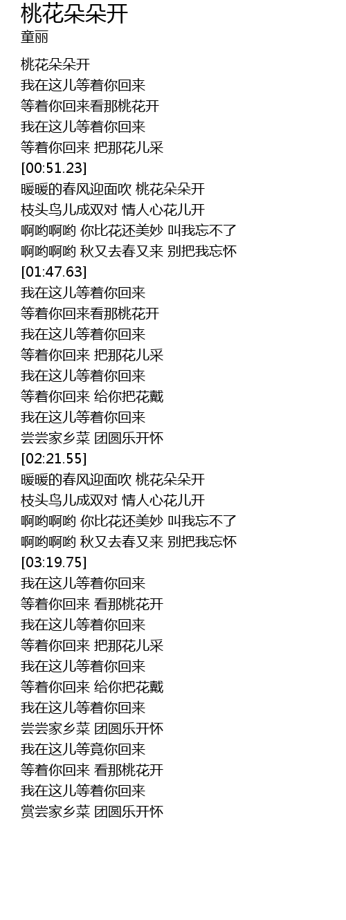 | [02:46.20] | 暖暖的春风迎面吹 桃花朵朵开 |