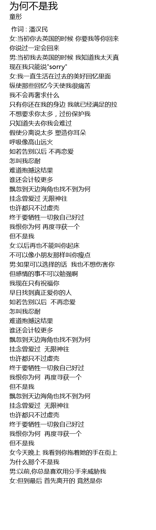 | [00:04.68] | nǚ: dāng chū nǐ qù yīng guó de shí hòu nǐ yào wǒ děng nǐ huí lái |