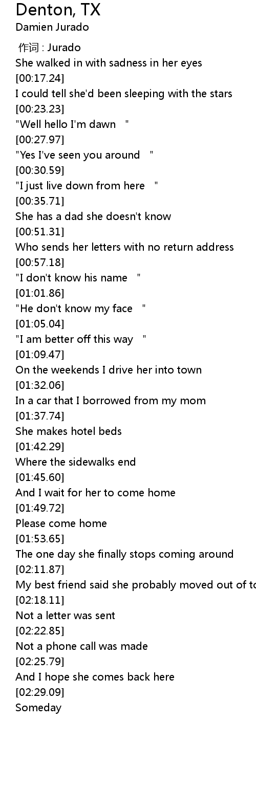 | [00:19.42] | I could tell she'd been sleeping with the stars |