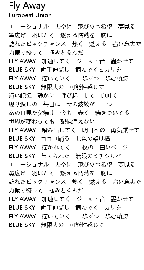 | [03:14.61] | FLY AWAY 加速してく ジェット音 轟かせて |