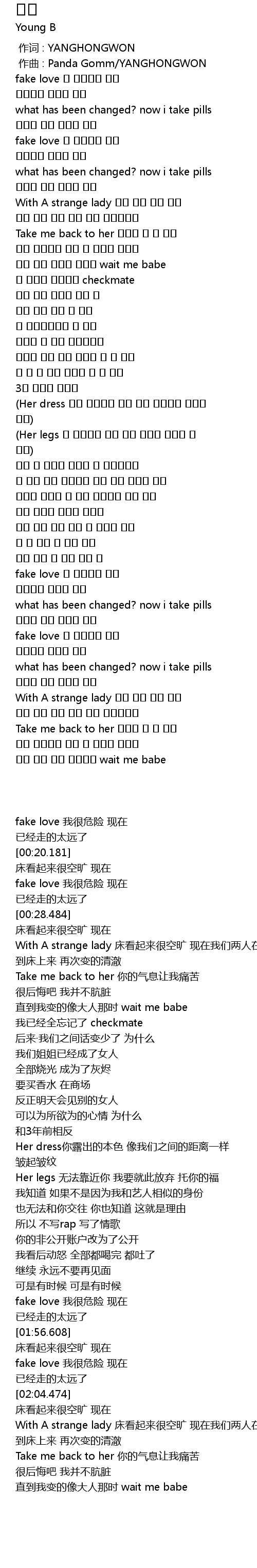 | [01:52.538] | fake love 난 위험하지 지금 |