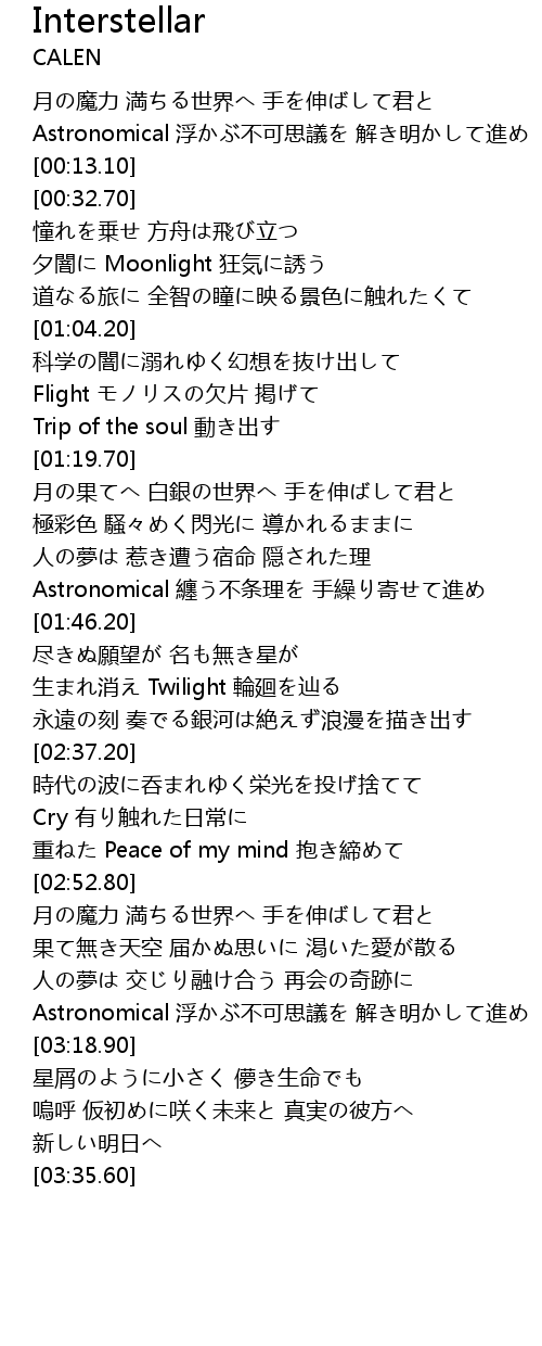 | [00:06.60] | Astronomical 浮かぶ不可思議を 解き明かして進め |