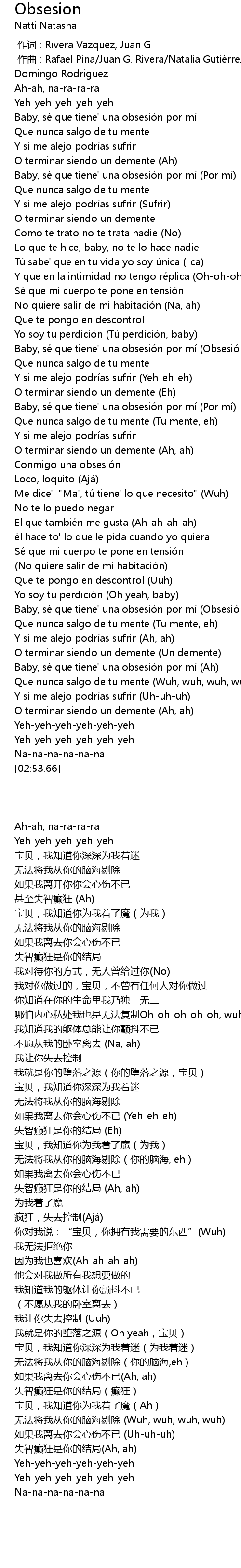 | [02:14.12] | Baby, se que tiene' una obsesio n por mi Obsesio n por mi |
