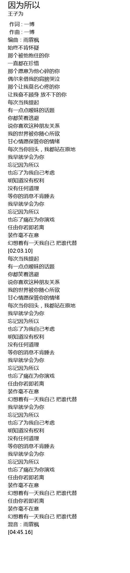 | [03:16.76] | wàng jì yīn wèi suǒ yǐ |