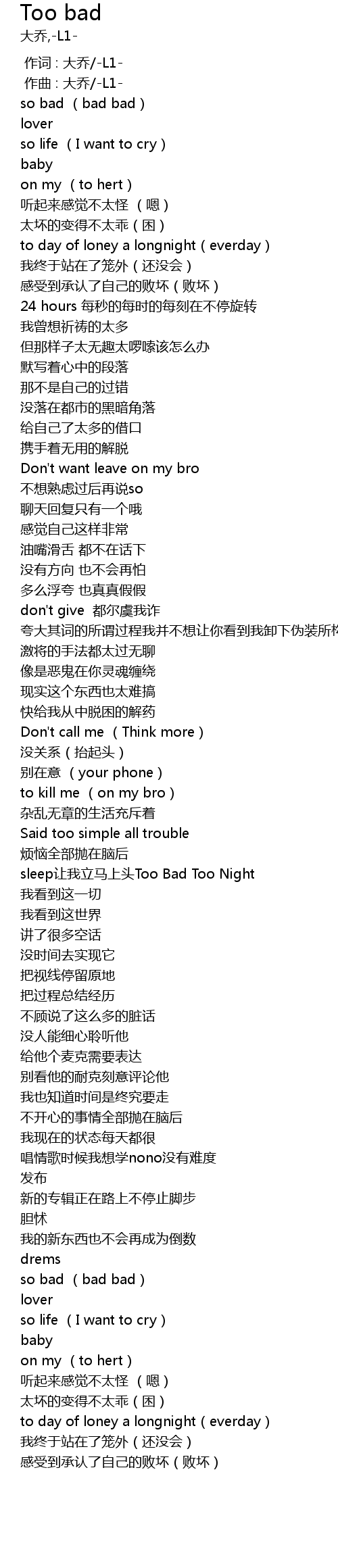 | [01:38.449] | sleep ràng wǒ lì mǎ shàng tou Too Bad Too Night |