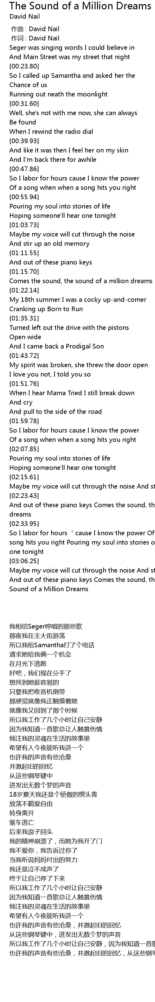 | [03:07.30] | Maybe my voice will cut through the noise And stir up an old memory And out of these piano keys Comes the sound, the sound of a million dreams The Sound of a Million Dreams |