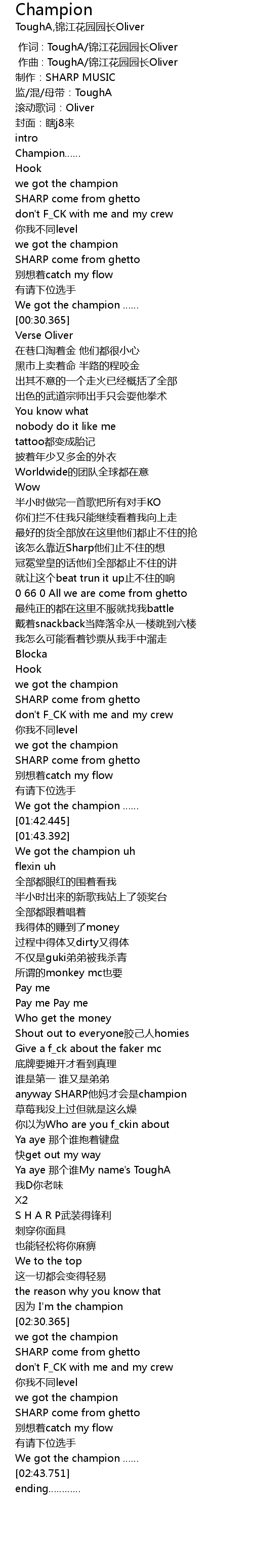 | [00:00.000] | 作词 : ToughA/锦江花园园长Oliver |