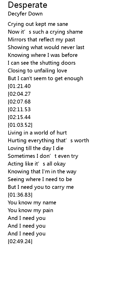 | [02:23.15][02:07.68][01:25.23][00:46.48] | I desperately need you |