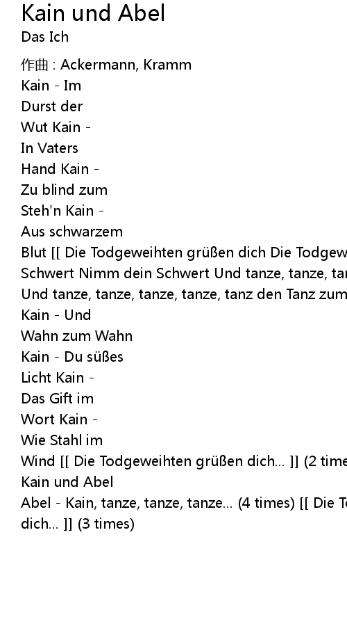 | Abel - Kain, tanze, tanze, tanze... (4 times) [[ Die Todgeweihten grüßen dich... ]] (3 times) |