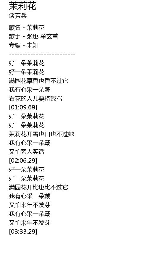 | [01:48.49] | 茉莉花开雪也白也不过她 |