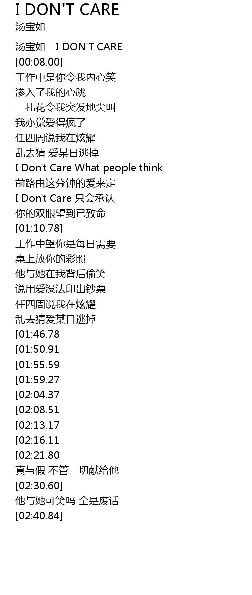 | [00:02.00] | 汤宝如 - I DON'T CARE |
