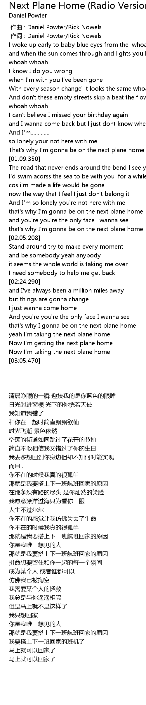 | [02:00.199] | that' s why I' m gonna be on the next plane home |