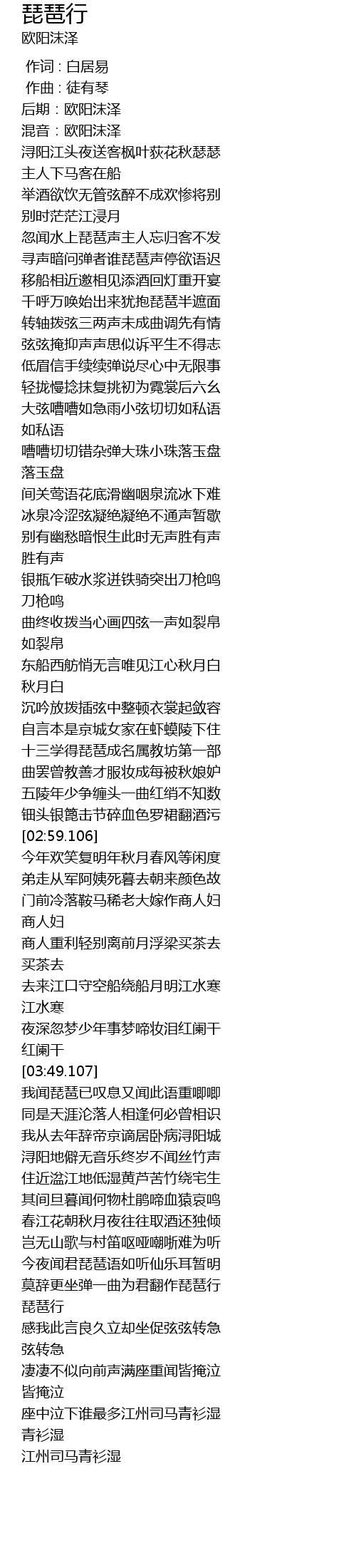 | [04:31.114] | 莫辞更坐弹一曲为君翻作琵琶行 |