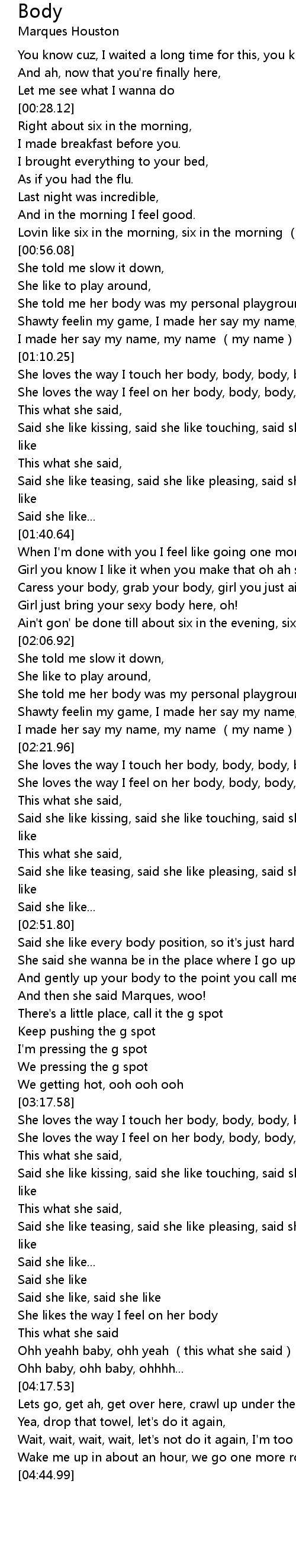 | [02:30.63] | She loves the way I feel on her body, body, body, body, body |