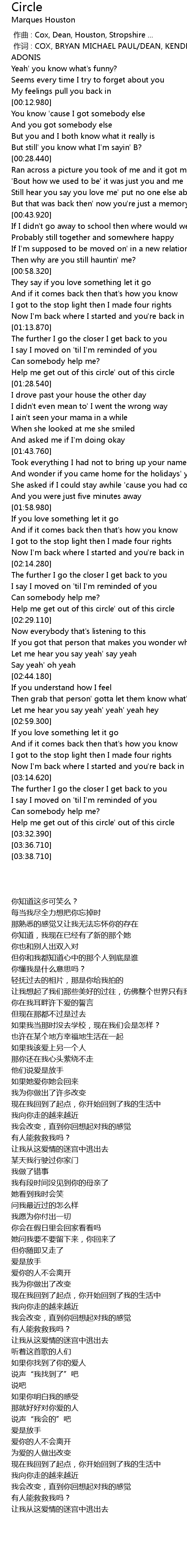 | [03:25.810] | Help me get out of this circle' out of this circle |