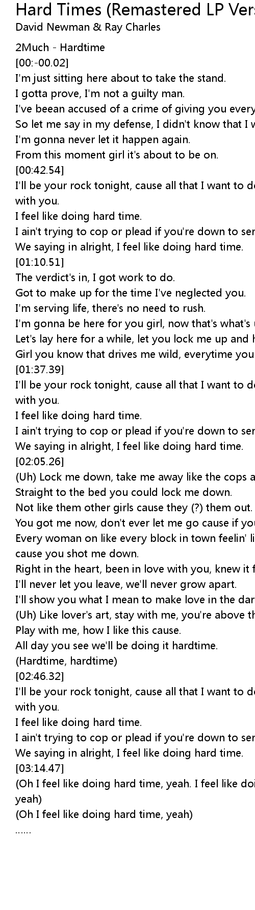 | [03:14.80] | Oh I feel like doing hard time, yeah. I feel like doing hard time, yeah |
