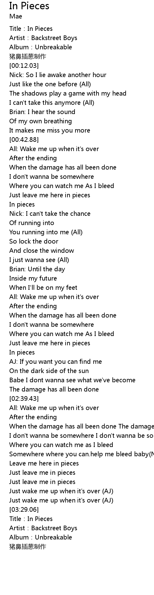 | [03:23.93] | Just wake me up when it's over (AJ) |