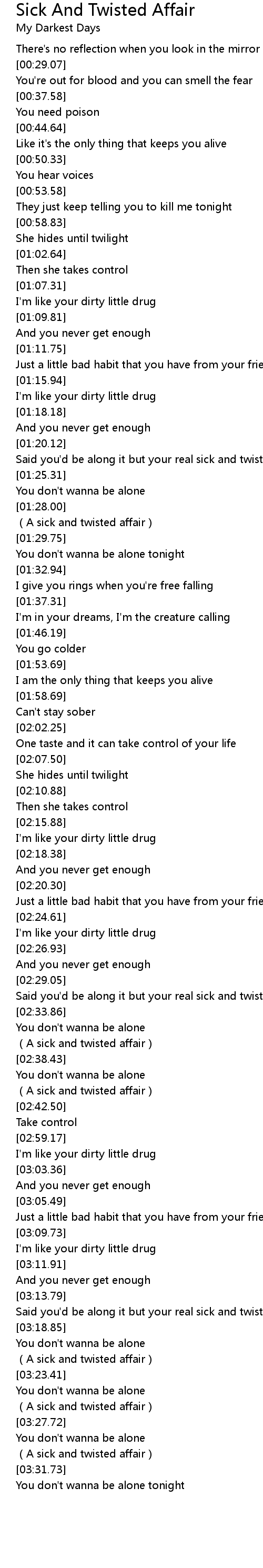 | [03:15.23] | Said you'd be along it but your real sick and twisted affair |